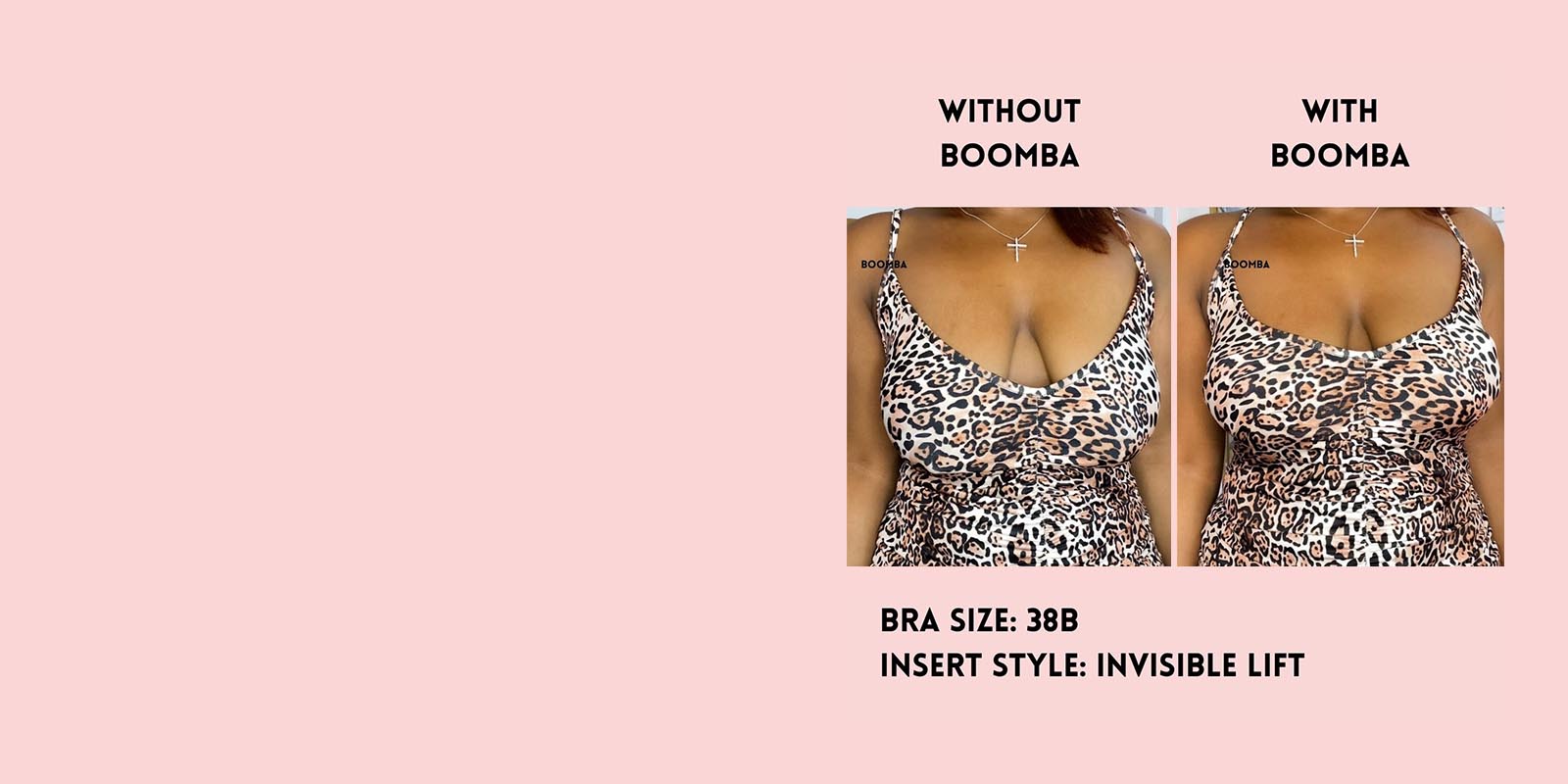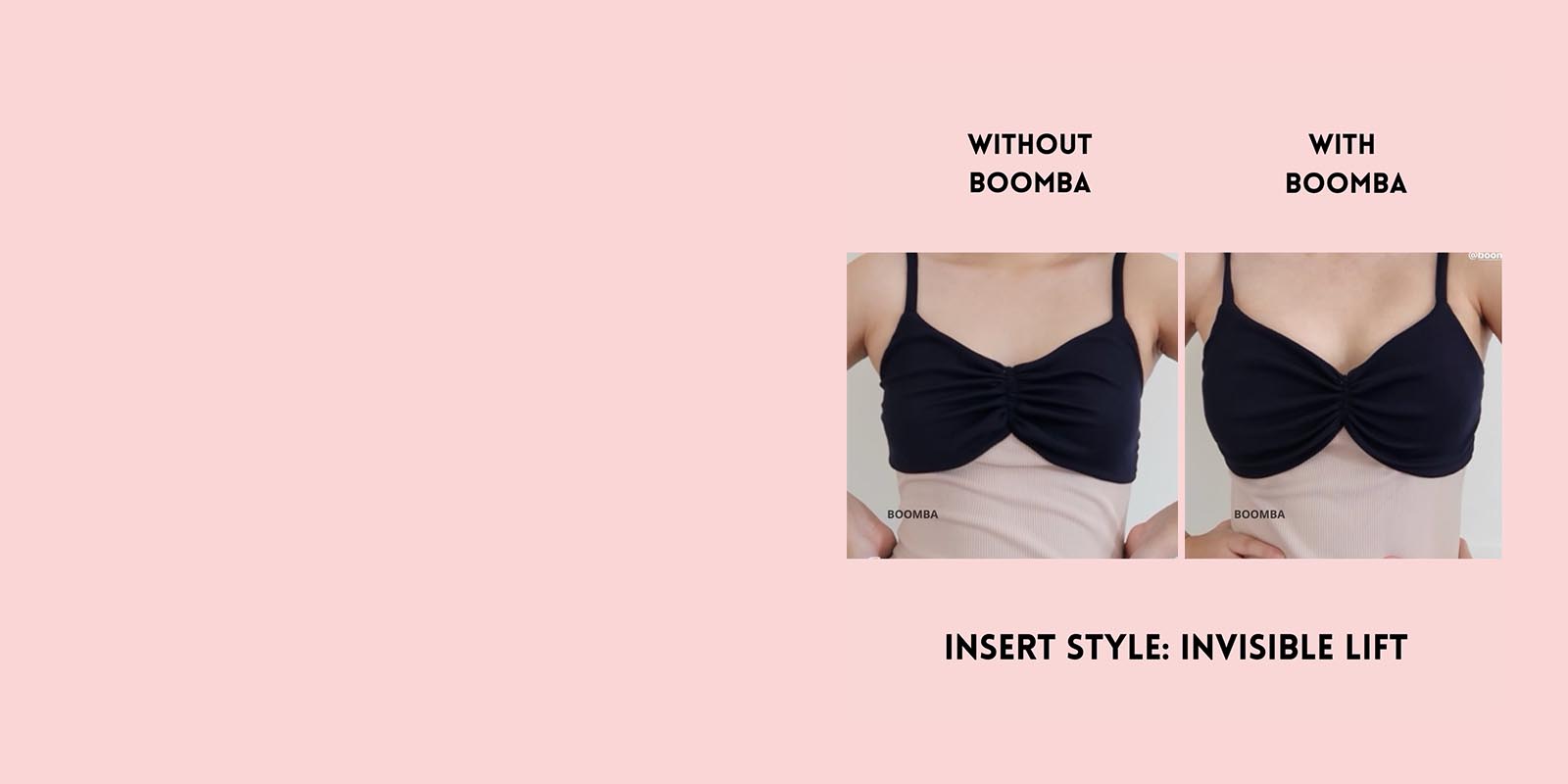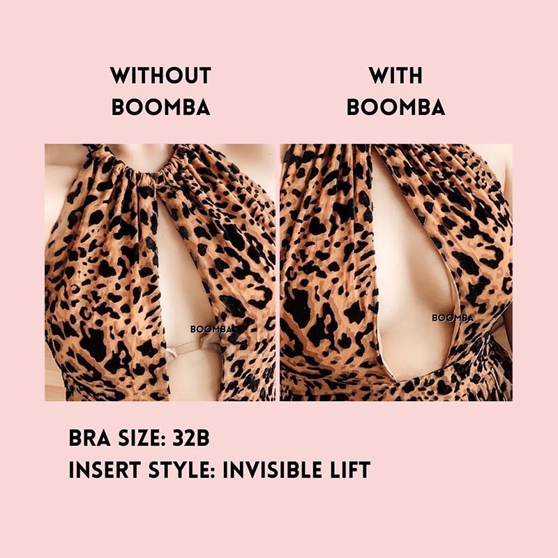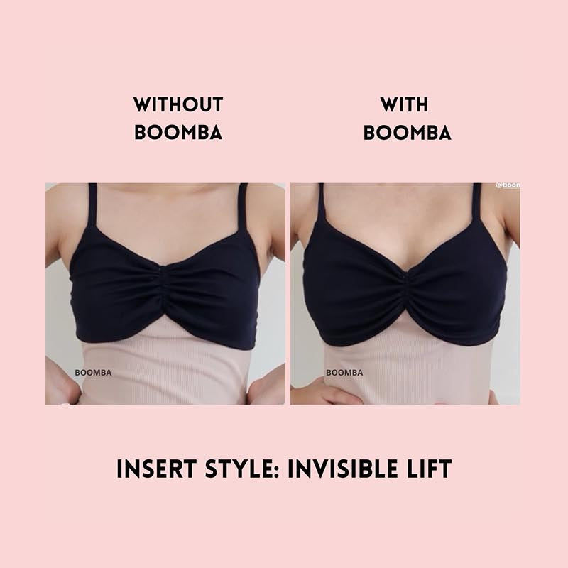 Please note that results may vary depending on breast size and shape. Results will be similar to a double push-up bra. BOOMBA results work best with natural breasts. Invisible Lift Inserts come in two sizes (small and medium). Size small is suitable for cup sizes A / B / C and size medium is suitable for sizes D / E.